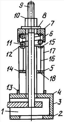 Колебания виброизолируемого объекта воспринимает пружина 11, ослабляя тем самым динамическое воздействие. Горизонтальные нагрузки воспринимаются маятниковым подвесом. Упорная шайба 8, взаимодействующая с гайкой 10 и втулкой 7, выполнена из упругого материала для гашения ударных нагрузок при посадке виброизолирующей системы на упоры. Выполнение демпфирующего элемента 5 гидравлического типа позволяет существенно повысить демпфирование в системе на резонансных режимах работы за счет диссипации энергии при прохождении среды через дросселирующие отверстия 18 в поршне 14.