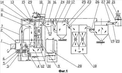 Установка также содержит последовательно установленные вихревой аппарат 16 для предварительной очистки дымовых газов, каталитический реактор 17 для очистки дымовых газов от недогоревших органических токсинов, дополнительный газоохладитель 18, рукавный фильтр 19 для тонкой очистки дымовых газов от мелких частиц пыли, дымосос 20 и дымовую трубу 21. Каталитический реактор 17 соединен с вихревым аппаратом 16 и дополнительным газоохладителем 18 газопроводами 22 и 23 с вертикальными участками, в которые, соответственно, вмонтированы вертикально ориентированные форсунки 24 и 25 для распыления щелочного раствора. На входе и выходе из рукавного фильтра 19 установлены, соответственно, патрубки для подсасывания воздуха 26 и 27. Установка также оборудована системой 28 подачи топлива к горелкам, системой 29 подачи щелочного раствора к форсункам и системой 30 подачи нагретого в рекуператоре воздуха в печь и камеру дожигания. В газоходе на выходе из комбинированного рекуператора 9 с газоохладителем 10 установлен дроссельный клапан 31, предназначенный для регулирования давления – разрежения в печи 2. В расширении дымовой трубы 21 установлены угольный фильтр 32 для обеспечения конденсации и адсорбции паров ртути и других тяжелых металлов.