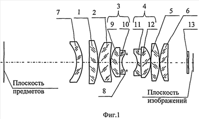 5=(0,10÷1,30); 6=(0,88÷1,05); | 7|<0,35, отличающийся тем, что отрицательный мениск третьего компонента выполнен склеенным из положительной и отрицательной линз, шестой компонент выполнен в виде положительного мениска, обращенного вогнутой поверхностью к пространству изображений, седьмой компонент размещен по ходу лучей перед первым компонентом, шестой и седьмой компоненты имеют малые подвижки вдоль оптической оси, при этом относительные оптические силы 1, 2, 4 первого, второго, четвертого компонентов составляют соответственно 1=0,60÷0,75;