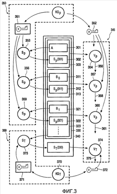 На Фиг.3 показан набор индивидуально подписанных частичных прав 330 согласно настоящему изобретению. Он содержит некоторое количество частичных прав 301, 311, 321, причем их количество может быть большим. В системе 350 под управлением Р частичные права подписывают. Секретный ключ 351, принадлежащий Р, используют в процессе 353 подписи частичных прав 301 для генерации подписи 302. Такой же процесс подписи используют для вычисления подписи 312, принадлежащей Р, для частичных прав 311, и т.д. Эти подписанные права, необязательно вместе с другими подписанными правами формируют новый набор индивидуально подписанных частичных прав 330. Теперь каждые частичные права могут быть проверены по отдельности в системе 345 в процессах 354, 357, и 360 проверки для определения, являются ли подписи действительными (выходы 355, 358, и 361 соответственно). Такая проверка может быть выполнена любым устройством, в домене, которое имеет доступ к частичным правам. Такое устройство может проверить, не были ли права аннулированы издателем или не был ли аннулирован сам издатель.