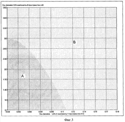 См. фиг.3 при вычисленных по приведенным формулам значениях, попадающих в область «А» – делается вывод о наличии паталогии (исследуемая клетка относится к типу бластных). Соответственно в область «В» – об отсутствии паталогии (исследуемая клетка относится к лимфоцитам).