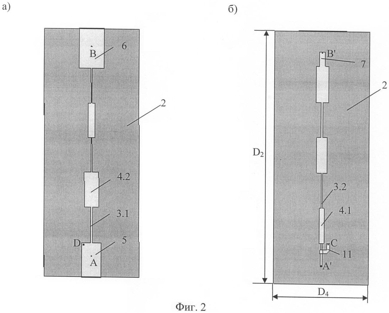 на фиг.2а, б иллюстрируются соответственно передняя и задняя стороны диэлектрической пластины резонатора с нанесенными на ней элементами отрезков микрополосковых линий для случая N=5;