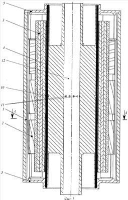 При малой длине ротора 6 его вал может быть сплошным. При большой длине ротора целесообразно выполнить вал полым, при этом на его сплошной наружной цилиндрической поверхности может быть выполнена кольцевая канавка 10, вдоль окружности которой целесообразно выполнить несколько сквозных радиальных отверстий 11, соединяющих полость 12 вала 8 с внешней поверхностью ротора 6.