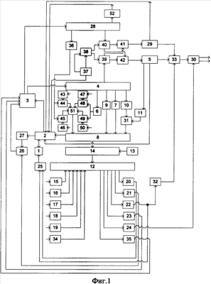 Устройство для оценки технического состояния и обеспечения устойчивости каналов и средств связи в телекоммуникационных системах, показанное на фиг.1, содержит: блок ввода-вывода 1, распределитель 2, блок коммутации 3, распределитель сообщений 4, канальный модуль 5, первый определитель занятости блока памяти 6, первый определитель аварийности каналов 7, шифратор 8, первый элемент памяти 9, второй элемент памяти 10, третий элемент памяти 11, блок сравнения чисел 12, датчик локального времени 13, накопитель 14, накопитель описания ситуации по блокировке блока ввода-вывода 15, накопитель описания ситуации по ограничению нагрузки 16, накопитель описания ситуации по тревожной сигнализации 17, накопитель описания ситуации по аварийности АПД 18, накопитель описания ситуации по аварийности каналов 19, накопитель команд управления по блокировке блока ввода-вывода 20, накопитель команд управления по ограничению нагрузки 21, накопитель команд управления по тревожной сигнализации 22, накопитель команд управления по аварийности АПД 23, накопитель команд управления по аварийности каналов 24, первый элемент ИЛИ 25, первый элемент И 26, анализатор категории срочности 27, резервный распределитель сообщений 28, резервный канальный модуль 29, переключатель 30, второй элемент ИЛИ 31, формирователь служебного сообщения 32, третий элемент ИЛИ 33, накопитель описания ситуации превышения нагрузки 34 (М.Х.Джонс «Электроника, практический курс». – М.: Постмаркет, 1999. – 528 с.) (стр.310-311), накопитель команд управления 35 (М.Х.Джонс «Электроника, практический курс». – М.: Постмаркет, 1999. – 528 с.) (стр.310-311), второй определитель занятости блока памяти 36, демультиплексор 37 (М.Х.Джонс «Электроника, практический курс». – М.: Постмаркет, 1999. – 528 с.) (стр.418-420), первый ключ 38 (М.Х.Джонс «Электроника, практический курс». – М.: Постмаркет, 1999. – 528 с.) (стр.210-211), второй ключ 39 (М.Х.Джонс «Электроника, практический курс». – М.: Постмаркет, 1999. – 528 с.) (стр.210-211), третий ключ 40 (М.Х.Джонс «Электроника, практический курс». – М.: Постмаркет, 1999. – 528 с.) (стр.210-211), первый мультиплексор 41 (М.Х.Джонс «Электроника, практический курс». – М.: Постмаркет, 1999. – 528 с.) (стр.418-420), второй мультиплексор 42 (М.Х.Джонс «Электроника, практический курс». – М.: Постмаркет, 1999. – 528 с.) (стр.418-420), первый регистр памяти 43 (М.Х.Джонс «Электроника, практический курс». – М.: Постмаркет, 1999. – 528 с.) (стр.390-391), второй элемент И 44 (Токхейм Р. «Основы цифровой электроники»: Пер. с англ. – М.: Мир, 1998. – 392 с.) (стр.47-48), третий элемент И 45 (Токхейм Р. «Основы цифровой электроники»: Пер. с англ. – М.: Мир, 1998. – 392 с.) (стр.47-48), второй регистр памяти 46 (М.Х.Джонс «Электроника, практический курс». – М.: Постмаркет, 1999. – 528 с.) (стр.390-391), третий регистр памяти 47 (М.Х.Джонс «Электроника, практический курс». – М.: Постмаркет, 1999. – 528 с.) (стр.390-391), четвертый элемент И 48 (Токхейм Р. «Основы цифровой электроники»: Пер. с англ. – М.: Мир, 1998. – 392 с.) (стр.47-48), пятый элемент И 49 (Токхейм Р. «Основы цифровой электроники»: Пер. с англ. – М.: Мир, 1998. – 392 с.) (стр.47-48), четвертый регистр памяти 50 (М.Х.Джонс «Электроника, практический курс». – М.: Постмаркет, 1999. – 528 с.) (стр.390-391), шестой элемент И 51 (Токхейм Р. «Основы цифровой электроники»: Пер. с англ. – М.: Мир, 1998. – 392 с.) (стр.47-48), второй определитель аварийности каналов 52.