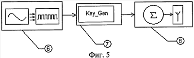 Основные модули, из которых состоит устройство, включены последовательно. Исходная продукция (сигнал, который подлежит передаче), проходит этап аналогово-цифрового преобразования в модуле 6, после этого, он проходит этап аппроксимации и шифрования с помощью ключей-полиномов в модуле 7. В модуле 8 осуществляется передача конечного продукта по радиоканалу.