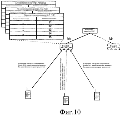 На фиг.10 показывается примерная ситуация, где три UE посылают запросы о планировании в планирующий узел B. Запросы о планировании содержат информацию об ID очереди приоритета очереди приоритетов, в которой хранятся данные восходящей линии связи, которые необходимо передать. Дополнительно, запрос о планировании может, например, указывать загруженность буфера (BO) UE и доступную мощность передачи (мощность Tx). В соответствии с одним вариантом осуществления запросы о планировании предоставляются в узел B через управляемую передачу сигналов MAC. Например, запрос о планировании может быть передан в управляющий PDU MAC-e. Это будет иметь преимущество в том, что передача запросов о планировании обрабатывается посредством протокола HARQ и, таким образом, их успешная доставка может быть гарантирована.