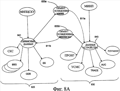 Рассмотрим вначале фигуру 8А, в вариантах выполнения настоящего изобретения, данные, необходимые для воплощения передачи голоса или данных, разделены на два набора данных: один набор 825, называемый служебными данными, ассоциирован с линией или МНПЦСКУ; и другой набор 830, называемый данными устройства, ассоциирован с устройством или МИНП. Данные устройства в этом контексте содержат текущий РВП, ключи шифрования и т.п., в то время как служебные данные в этом контексте содержат запрет вызова, передачу вызова, сетевые установки и т.п., и служебные данные и данные устройства предпочтительно воплощены как объекты, имеющие связи с множеством других объектов, которые требуются для поддержки связи. Более конкретно, набор данных 825, который относится к услугам, доступным для абонента, ассоциированного с объектом МНПЦСКУЮ, расположен в иерархии первого объекта, в то время как набор данных 830 устройства, ассоциированный с объектом МИНП, расположен в иерархии второго объекта. Для сборки данных, требуемых для поддержки конкретной комбинации МНПЦСКУ/МИНП, РМД 135 должен обращаться к обоим наборам 825, 830 служебных данных и данных физического устройства для обработки данных и для передачи обработанных данных в ЦКП/РВП 125.