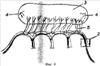 где 1 – венозно-артериальный пучок на дистальном конце кишки, 2 – радиарная вена и перевязанная радиарная артерия, 3 – тонкокишечный аутотрансплантат, 4 – заглушенный конец кишки, 5 – сосудистая сеть.