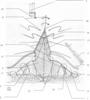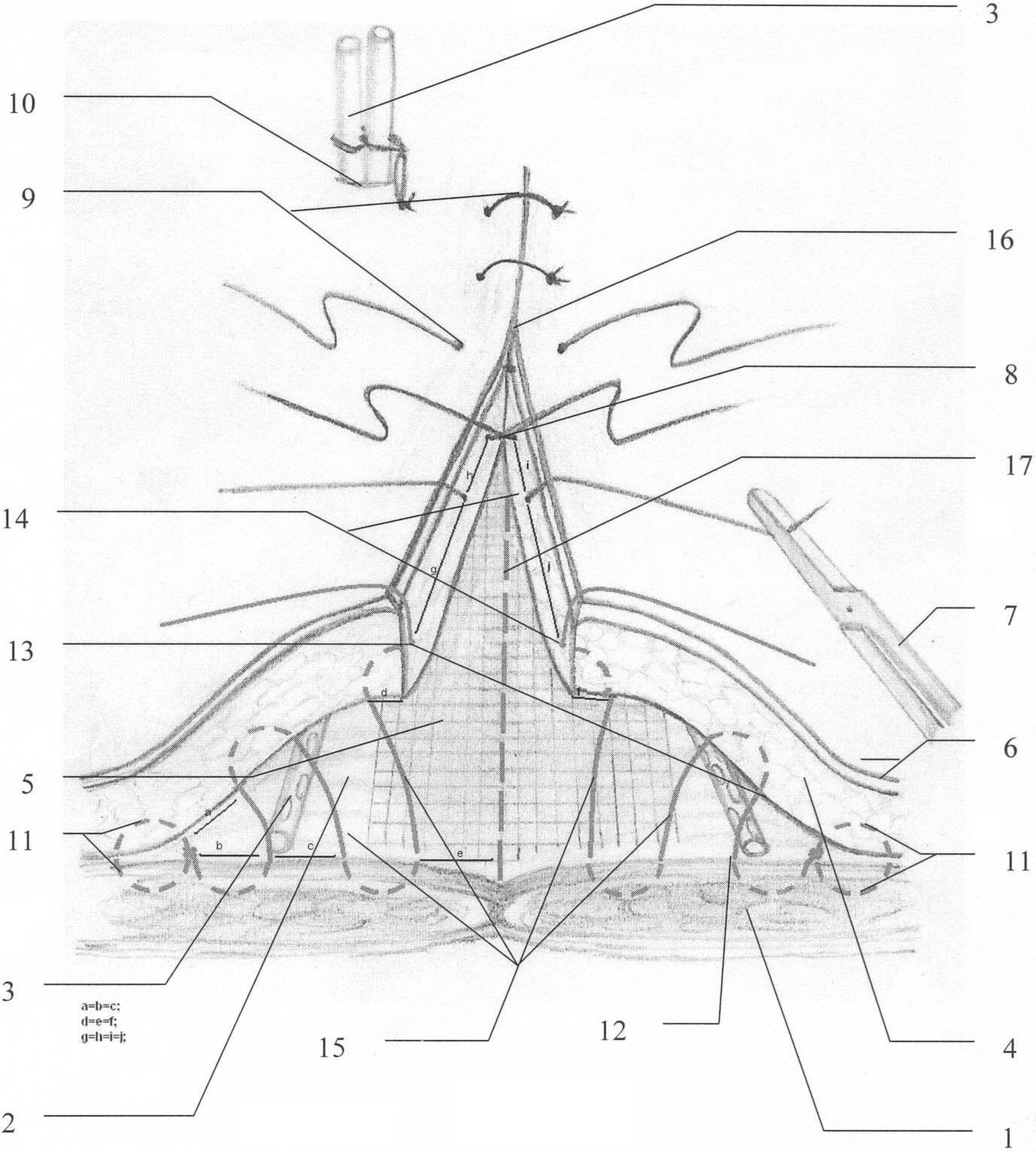 где 1 – мышцы передней брюшной стенки; 2 – фасциально-апоневротическое образование; 3 – поливинилхлоридные трубки с перфорационными отверстиями; 4 – подкожная жировая клетчатка; 5 – синтетический сетчатый протез; 6 – кожа; 7 – зажим; 8 – фиксирующий центральный узел; 9 – однорядный узловой шов на кожу; 10 – контрапертурное отверстие; 11 – закрепляющий узловой шов; 12 – точка выкола из фасциально-апоневротического образования; 13 – точка вкола в подкожную жировую клетчатку; 14 – центральная точка выкола из подкожной жировой клетчатки; 15 – многостежковый сводящий шов; 16 – кожный разрез; 17 – срединная линия раны.