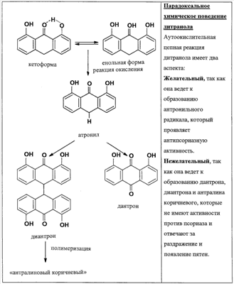 Фармакокинетика и фармакодинамика (Muller, 1996, Reichert et al., 1985, Shroot et al., 1992) При топическом применении дитранол проникает в кожу через поврежденный роговой слой через 30 мин и самая высокая концентрация неизменившегося дитранола содержится в ороговевшем слое. Но при некоторых формах псориаза дитранол проникает с трудом и поэтому в качестве кератолитического агента (для повышения проницаемости) вводится салициловая кислота. Известно, что дитранол проявляет свою антипсориазную активность более чем одним путем. Он действует на разных клеточном, внутриклеточном и межклеточном уровнях, что включает нуклеиновые кислоты, различные биохимические пути и иммуно-опосредованные реакции и т.д. при проявлении терапевтической эффективности. Он ингибирует пролиферацию кератиноцитов и приводит к нормализации экспрессии кератина. Скорость обмена эпидермальных клеток снижается применением дитранола, приводя к облегчению симптомов болезни. Он также оказывает сильное действие на клеточное дыхание. Прицельной органеллой для дитранола является митохондрий, где он аккумулируется и ингибирует клеточное дыхание путем взаимодействия с целью переноса электронов, что в конце концов приводит к ослаблению синтеза АТР. Уменьшение потока клеточной энергии приводит к ингибированию зависимого от энергии процесса, такого как репликация ДНК, которая замедляет чрезмерное деление клеток, что наблюдается в случае псориаза. Механизм действия дитранола и его химическая реакционноспособность (Goranson 1987, Mustakallio 1984, Shroot et al., 1992). Ключевым моментом химического поведения дитранола является его восстановительная химия, понимание которой помогает понять риски и преимущества применения этого лекарства. Химическая реакционноспособность гидроксиантрона может быть приписана: а) фенольным гидроксильным группам у C1 и C8, б) двум реакционноспособным атомам водорода у С10. Было обнаружено, что во время аутоокислительного процесса кетоенольный таутомеризм дитранола изменяется, что приводит к образованию 1,8-дигидроксиантрахинона (дантрона) и 1,8, 1′,8′-тетрагидроксидиантрона (диантрона) через антронильный радикал. Химические пути разложения (или пути антипсориазной активности) показаны на следующей схеме: Окисление дитранола зависит как от величины рН, так и от света. Дитранол характеризуется химическим поведением, включающим отделение атома водорода и перенос электронов с образованием соответствующего антронильного радикала. Эта химическая реакция (то есть аутоокисление), которая приводит к изменению клеточного метаболизма, объясняет широкий спектр фармакологии дитранола, когда он действует как донор электронов и ингибирует цепь переноса электронов. Кроме того, цепное окисление приводит к образованию неохарактеризованных продуктов, известных под названием “антралин коричневый” или “дитранол коричневый”, которые отвечают за появление фиолетово-коричневых пятен и полос на коже. Все эти продукты окисления дитранола (а именно дантрон, диантрон и дитранол коричневый) не обладают активностью в отношении псориаза и отвечают за основные побочные эффекты от применения дитранола. Таким образом, наблюдается парадоксальная ситуация, когда химическая реакционноспособность дитранола необходима для действия против псориаза в виде процесса, генерирующего электр