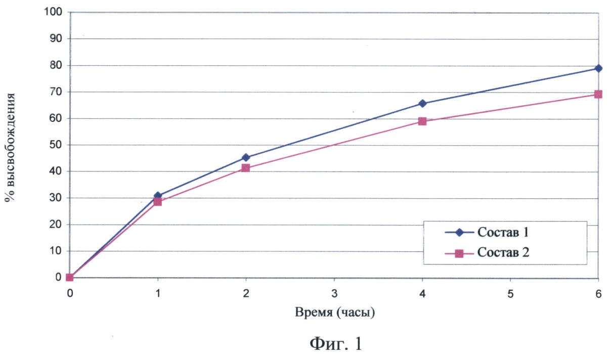 Фиг.1 – профили высвобождения in vitro составов 1 и 2.