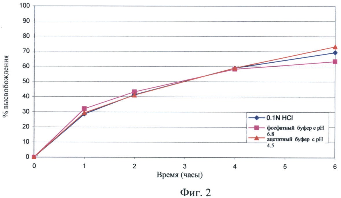 Было установлено, что вышеупомянутых требуемых характеристик можно добиться благодаря предлагаемой лекарственной форме путем использования комбинации неполимерного ингибитора высвобождения и ненабухающего pH-независимого ингибитора высвобождения. Общеизвестно, что использование pH-независимых ингибиторов высвобождения отдельно приводит к высокому начальному «взрывному» высвобождению. Однако его комбинация с неполимерными ингибиторами высвобождения позволяет получить лекарственную форму с поддерживаемым высвобождением, которая высвобождает лекарственное средство с уменьшенным начальным «взрывом» и со скоростью, не зависящей от окружающей среды, в течение значительного периода. Используемый технологический процесс отличается простотой, воспроизводимостью и подходит для крупномасштабного производства с использованием обычного оборудования.