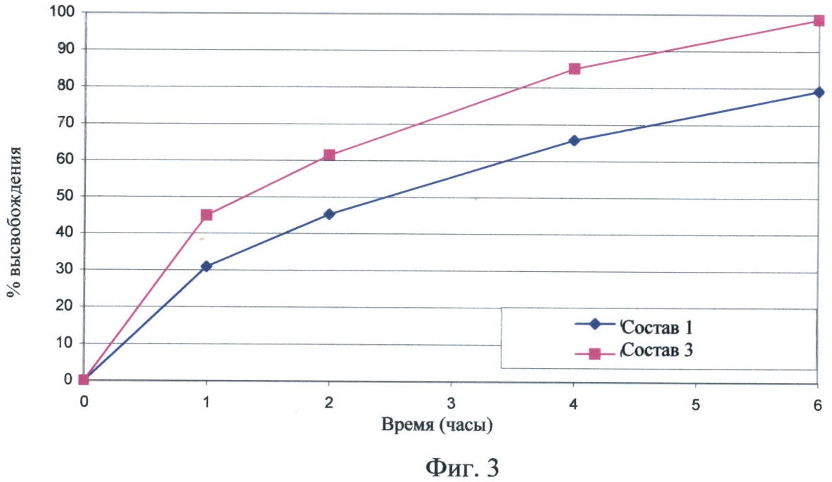Фиг.3 – профиль высвобождения in vitro таблеток витамина С составов 1 и 3.
