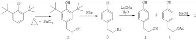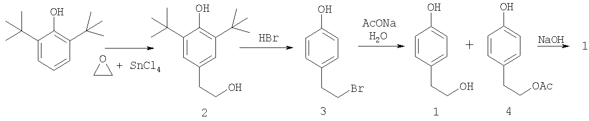 2,6-ди-трет-бутилфенол оксиэтилируется этиленоксидом в присутствии бутиллития и три-изо-бутилалюминия в толуоле при 5°С, с получением 4-(2-гидроксиэтил)-2,6-ди-трет-бутилфенола (2) с выходом 95% (чистотой 99%). Полученное соединение (2) деалкилируется с использованием п-толуолсульфоновой кислоты при 220°С. Удаление примесей производится экстракцией этилацетатом и перекристаллизацией с получением 4-(2-гидроксиэтил)фенола 95%-ной чистоты с выходом 95% [JP 2000319213]. Существенным недостатком этого способа получения 4-(2-гидроксиэтил)фенола является техническая сложность примененного способа гидроксиэтилирования 2,6-ди-трет-бутилфенола с использованием пожароопасных бутиллития и три-изо-бутилалюминия, производящихся промышленностью Японии. Эти реактивы дороги, имеют малый срок хранения и должны производиться на месте их потребления. Применение бутиллития вызывает высокую степень пожароопасности производства как на стадиях его синтеза, так и на стадии его применения [Вейганг – Хильгетаг. Методы эксперимента в органической химии. Изд. Химия. М. 1966. С. 637-638]. Высокая технологическая оснащенность такого производства 4-(2-гидроксиэтил)фенола, необходимая для устранения пожароопасности процесса, создает значительные трудности для его реализации. Задачей изобретения является разработка нового безопасного способа получения 4-(2-гидроксиэтил)фенола высокой степени чистоты (с содержанием основного вещества не менее 99,5%) на основе отечественного сырья. Задача решается получением 4-(2-гидроксиалкил)фенола (1) исходя из 2,6-ди-трет-бутилфенола в три стадии, представленных на схеме: Каждая из них принципиально известна, но содержит существенные новшества, позволяющие эффективно реализовать процесс в целом и получить 4-(2-гидроксиэтил) фенол высокой степени чистоты. Первая стадия заключается в гидроксиэтилировании 2,6-ди-трет-бутилфенола окисью этилена в присутствии катализатора SnCl4 c образованием 4-(2-гидроксиэтил)-2,6-ди-трет-бутилфенола (2). В известном способе описана подобная реакция 2,6-ди-трет-бутилфенола и окиси пропилена [US 4603161] с получением 4-(2-гидроксипропил)-2,6-ди-трет-бутилфенола (5) с выходом 11%. Нами установлено, что окиси олефинов при быстром их прибавлении в реакционную среду, содержащую кислотный катализатор, расходуются непроизводительно с преимущественным образованием дигликолей, которые протонируют катализатор, следствием чего является ускорение процессов де-трет-бутилирования с образованием побочных соединений: 4-трет-бутилфенола, 2,4-ди-трет-бутилфенола, 2,4,6-три-трет-бутилфенола и 4-(2-гидроксиэтил)-2-трет-бутилфенола. Снижение скорости этого нежелательного процесса достигается постепенным введением в реактор катализатора и окиси этилена и использованием в качестве растворителя трихлорэтилена, что в целом приводит к увеличению выхода соединения (2) до 92% (в расчете на вступивший в реакцию 2,6-ди-трет-бутилфенол). Вторая стадия получения 4-(2-гидроксиэтил)фенола описана в известном патенте [RU 2218326] и заключается в де-трет-бутилировании соединения (2) под действием бромистоводородной кислоты при температуре 120-130°С с одновременной заменой алифатической гидроксильной группы на бром, что приводит к почти количественному образованию 4-(2-бромэтил)фенола (3). Третья стадия протекает в одном сосуде и принципиально заключается в замещении брома в соедин