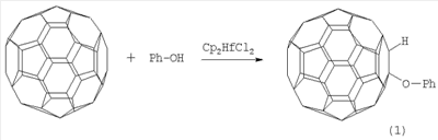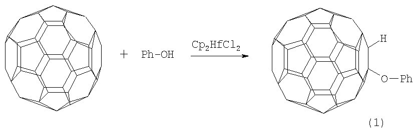 ПРИМЕР 1. В металлический автоклав объемом 17 мл помещают 0.01 ммоль фуллерена С60, 10 мл «сухого» толуола, 7 ммоль фенола и 0.002 ммоль катализатора Cp2HfCl2, перемешивают 6 часов при температуре 150°С, получают 1-фенокси-1,2-дигидрофуллерен (1) с выходом 73% (по данным ВЭЖХ).