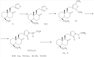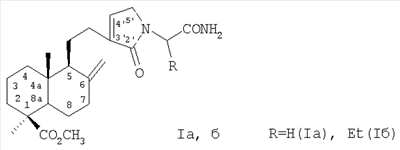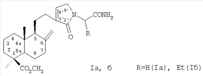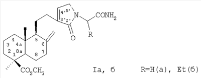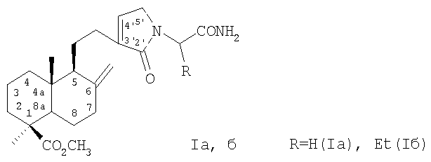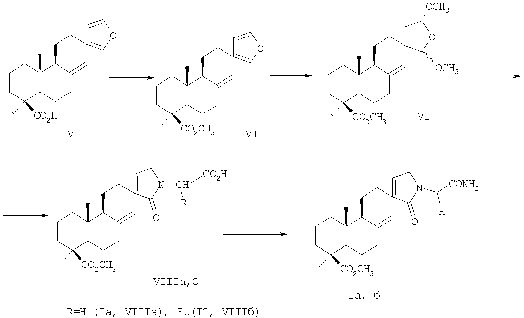 Заявляемые соединения (Ia, б) получают из ламбертиановой кислоты (V) по схеме 1. Взаимодействие доступных аминокислот (глицина или -аминомасляной кислоты) с терпеноидными ацеталями (VI), легко образующимися путем окислительного метоксилирования метилового эфира ламбертиановой кислоты (VII) по методике, описанной нами в работе [10], приводит к лабданоидным N-(1-карбоксиметил) или N-(1-карбоксипропил)-(5Н)-пиррол-2-онам (VIIIa, б). Обработка аминокислот (VIIIa, б) триметилхлорсиланом в метаноле и последующая (без выделения) реакция с аммиаком в метаноле дает соответствующие амиды (Iа, б). Выход соединений (Iа, б) составляет 48 и 42% соответственно в расчете на исходную ламбертиановую кислоту (V).