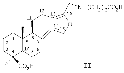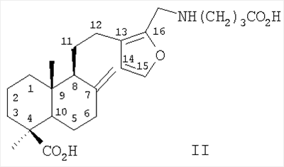 Аналогом по структуре указанных соединений является 16-(3-карбоксипропил-аминометил) замещенное производное метил 15,16-эпокси-7(17),13,14-лабдатриеноата (нумерация и название соединения (II) приведены по тривиальной номенклатуре для дитерпеноидов), формулы (II), обладающее ноотропной активностью [6].