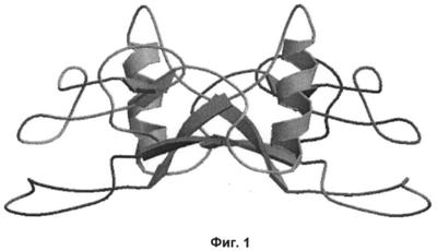 Исходными данными для работы послужили первичные и пространственные структуры белков, импортированные из банка данных Protein Data Bank [6]. В базе данных банка проводили поиск пространственной структуры TGF- . В результате для компьютерного конструирования отобрали пространственную структуру TGF- [4] (фиг.1).