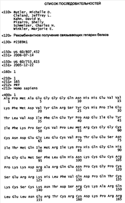 Множество связывающих гепарин белков, происходящих из млекопитающих, получены посредством рекомбинантного способа и являются клинически важными (Munoz and Linhardt, (2004) Arterioscler Thromb Vase Biol. 24:1549-1557; Favard et al. (1996) Diabetes and Metabolism 22(4):268- 73; Matsuda et al., (1995) J. Biochem. 118(3):643-9: Roberts et al., (1995) Brain Research 699(1):51-61). Например, VEGF является сильным митогеном для эндотелиальных клеток сосудов. Он известен также как фактор проницаемости сосудов (VPF). Смотри Dvorak et al., (1995) Am. J. Pathol. 146: 1029-39. VEGF играет важную роль как в васкулогенезе, развитии эмбриональной сосудистой сети, так и в ангиогенезе, процессе формирования новых кровеносных сосудов из уже существующих. Смотри, например, Ferrara, (2004) Endocrine Reviews 25(4):581-611; Risau et al., (1988) Dev. Biol. 125:441-450; Zachary. (1998) Intl. J. Biochem Cell Bio 30:1169-1174; Neufeld et al., (1999) FASEB J. 13:9-22; Ferrara (1999) J. MoL Med. 77:527-543; и Ferrara and Davis-Smyth, (1997) Endocri. Rev. 18:4-25. Клинические применения VEGF включают в себя применения, где на рост нового капиллярного ложа указывают, например, как на стимулирующий заживление ран (смотри, например, Международную публикацию No. WO 91/02058; и Декларацию поверенного No. P2358R1, озаглавленную «Заживление ран», поданную 16 июня 2006 г.), для стимуляции роста и восстановления тканей, например, печени (смотри, например, WO2003/0103581), кости (смотри, например, WO2003/094617) и т.д. Смотри также Ferrara, (2004) Endocrine Reviews 25(4):581-611.