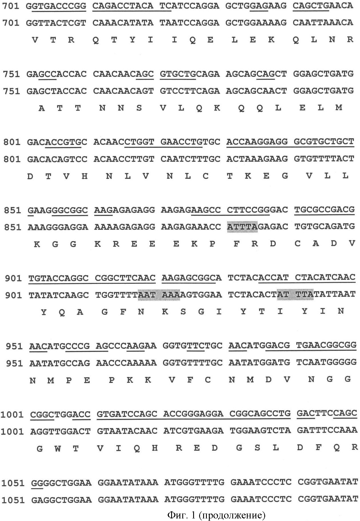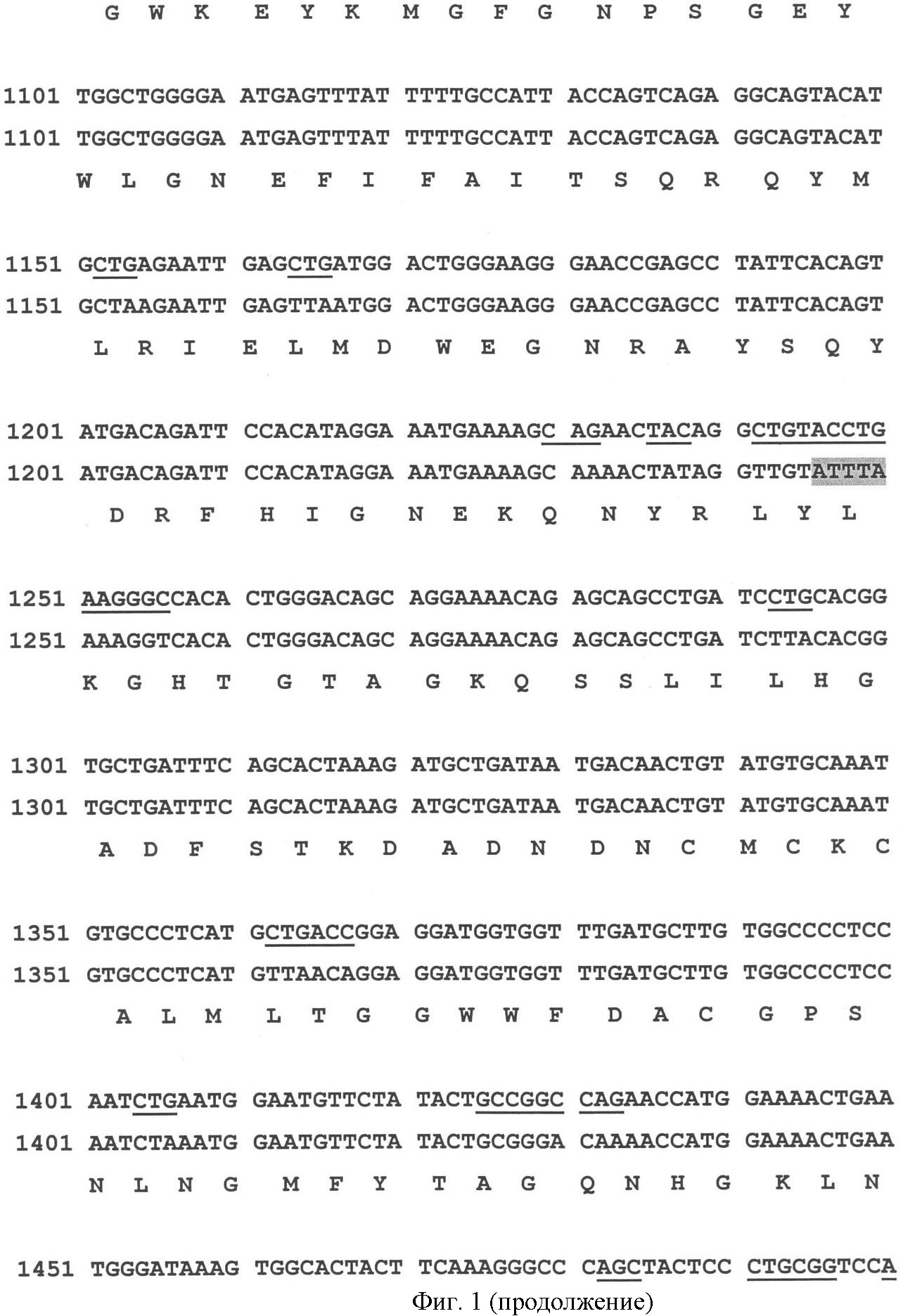 На фиг.1 показана последовательность нуклеотидов гена AGPopt (верхние строчки) в сравнении с последовательностью нуклеотидов природного гена ангиопоэтина-1 человека (средние строчки). Показана также последовательность аминокислот кодируемого белкового продукта (нижние строчки). Жирным шрифтом выделена область, кодирующая белок. Подчеркнуты триплеты нуклеотидов, подвергшиеся оптимизации. Затемнены сигналы разрушения мРНК АТТТА и полиаденилирования ААТААА.