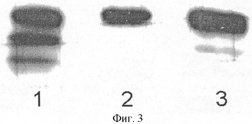 На фиг.3 показан вестерн-блоттинг белков культуральной среды клеток НЕК293, трансфицированных плазмидой pC4W-hAGP (дорожка 2) и плазмидой pC4W-AGPopt (дорожка 3). На дорожку 1 нанесено 20 нг рекомбинантного ангиопоэтина-1 человека.