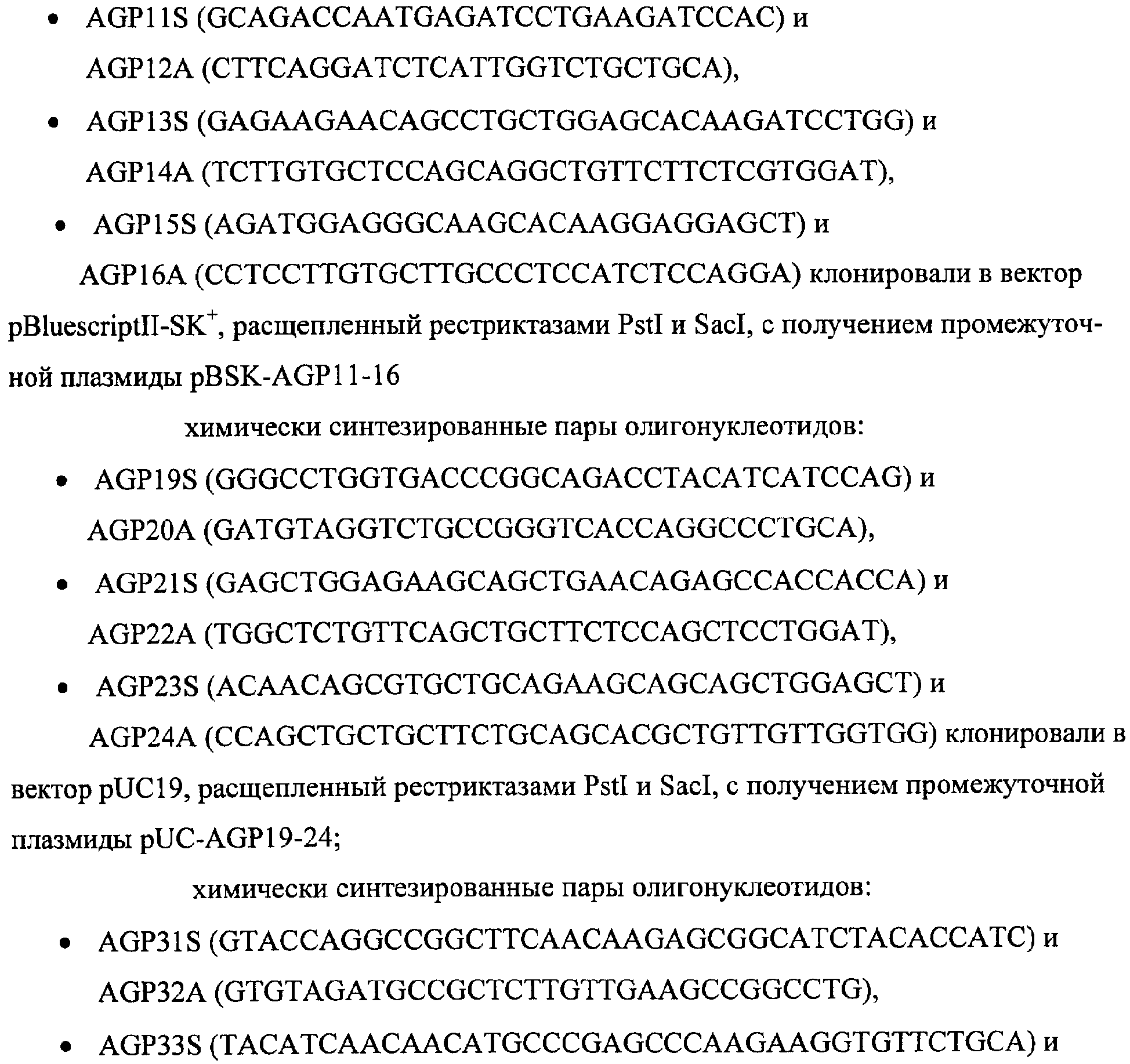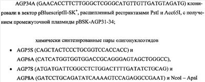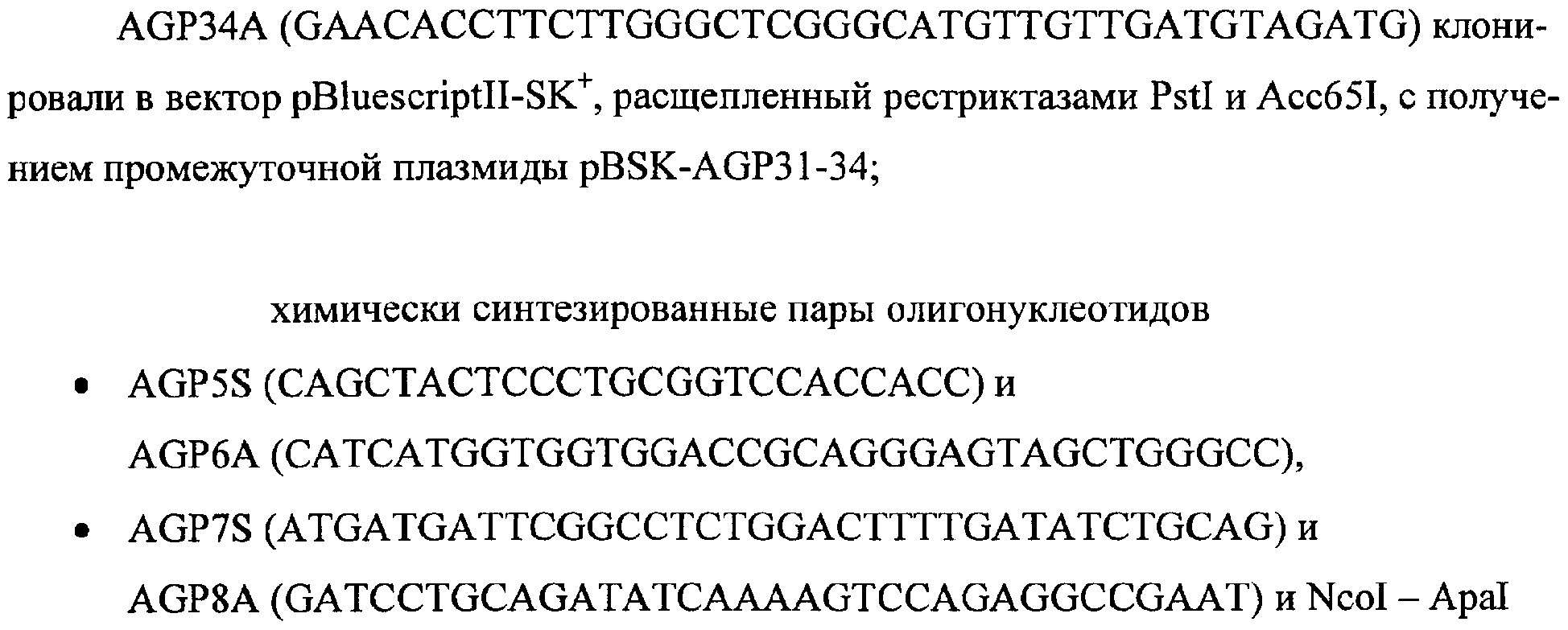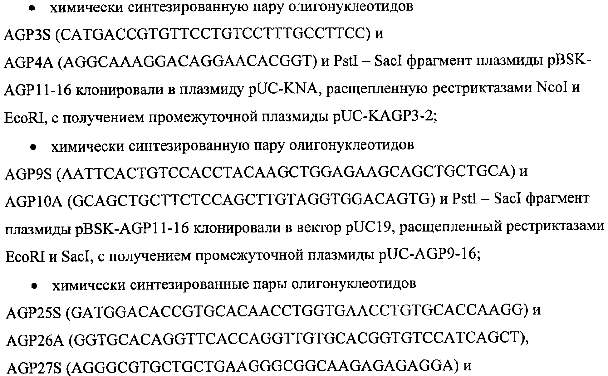 клонировали в плазмиду pBSK-AGP31-34, расщепленную рестриктазами PstI и XbaI, с получением промежуточной плазмиды pBSK-AGP31-38. HindIII – NcoI фрагмент плазмиды pBSK-AGP39-48 клонировали в плазмиду pBSK-AGPN-8, расщепленную рестриктазами HindIII и NcoI, с получением промежуточной плазмиды pBSK-AGP39-8. Встраивание соответствующих последовательностей ДНК подтверждали секвенированием.