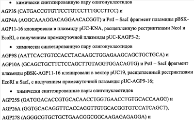 фрагмент плазмиды pcDNA3-hAGP клонировали в плазмиду pBSK-KNB, расщепленную рестриктазами NcoI и ВаmHI, с получением промежуточной плазмиды pBSK-AGPN-8. Фрагмент ДНК AGP39-48 расщепляли рестриктазами BamHI и SmaI и клонировали в расщепленный теми же рестриктазами вектор pBluescriptII-SK+ с получением промежуточной плазмиды pBSK-AGP39-48. Встраивание соответствующих последовательностей ДНК подтверждали секвенированием.