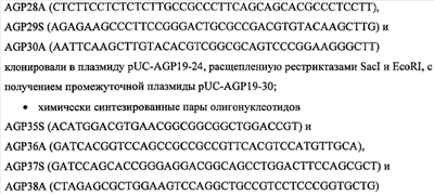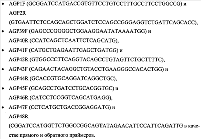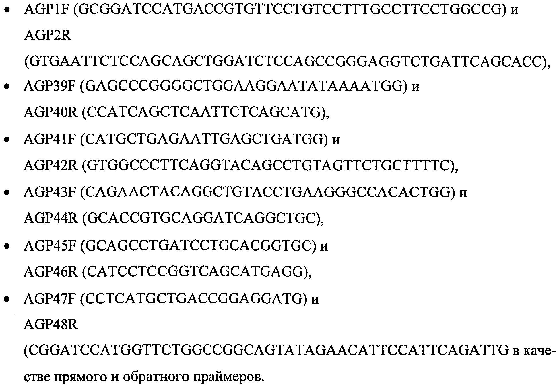 В результате получали фрагменты ДНК, соответственно AGP1-2, AGP39-40, AGP41-42, AGP43-44, AGP45-46, AGP47-48, которые очищали при помощи электрофореза в агарозном геле и электроэлюции.