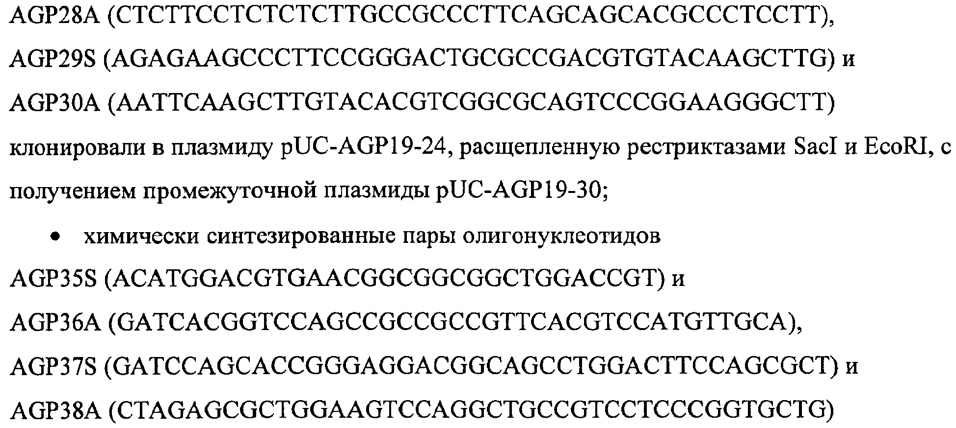 AGP18A (GGTTCTCCTTCTCCTCCTTCAGGGTGTCCAGCT) и SbfI – HindIII фрагмент плазмиды pUC-AGP19-30 клонировали в плазмиду pUC-AGP9-16, расщепленную рестриктазами SacI и HindIII, с получением промежуточной плазмиды pUC-AGP9-30;