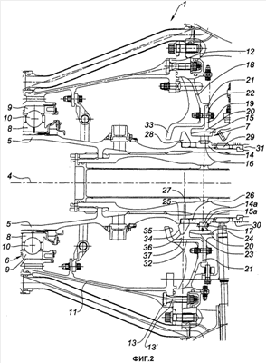 Однако, несмотря на различные защитные устройства, описанные выше, может происходить разрушение вала 5 компрессора. Поэтому предусмотрена система окончательной защиты. В случае разрушения вала 5 компрессора, вращение вентилятора 2 приводит вентилятор вперед с валом 5 компрессора, с которым он изготовлен за одно целое. Затем передняя поверхность 34 удерживающего диска 28 упирается в заднюю поверхность 35 ограничительного диска 33, составляющего одно целое с неподвижной конструкцией реактивного двигателя 1. Поэтому ограничительный диск 33 действует как осевой ограничитель для вентилятора 2 в случае разрушения вала 5 компрессора (или вала турбины, с которым вал 5 компрессора является одним целым). Преимущество сферической формы для этих двух несущих поверхностей 34, 35 удерживающего диска 28 и ограничительного диска 33, соответственно, здесь становится очевидным; она обеспечивает возможность однородного контакта независимо от наклона вала 5 компрессора относительно конструктивного фланца во время контакта.