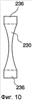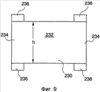 На фиг.8-10 изображен еще один вариант встраивания разделителя кабелей. На фиг.8 показан вид в перспективе корпусной части 212 разделителя с двойной тягой, вида, показанного на фиг.1 и 2, но который отличается от корпусной части фиг.1 и 2 тем, что выемка или вырез 214 выполнен в каждой наружной кромке каждого бокового плеча 220 и 222 приблизительно посередине между торцевой стенкой 218 и свободными концами 220a и 222a корпусной части. Предусмотрен разделитель кабелей, показанный на фиг.9 и 10. Разделитель кабелей 230 имеет основную корпусную часть 232, которая имеет высоту h, равную вертикальному промежутку между боковыми плечами 220 и 222, и относительно более высокие концы 234, которые определяют выступы 236 из корпусной части и проходят над и под основной частью корпуса. Выступы защелкиваются или плотно посажены в выемки 214 для закрепления разделителя кабелей, проходящего перпендикулярно через звено. Как лучше показано на фиг.10 в поперечном сечении, разделитель кабелей является более широким в своей верхней части и нижней части и наклонен к своему центру, в форме песочных часов. В основном, звено будет иметь толщину 20 мм или около этого в его верхней части и нижней части и до 2 мм – толщину в его средней части. Таким образом поддерживаются прочность и жесткость разделителя и звена, в то же время поддерживая общую ширину звена, измеряемую от торцевой стенки 218 корпусной части до торцевой стенки запирающего средства (не показана), настолько малой, насколько возможно. Это обеспечивает расположение, при котором электрический кабель и водовод могут быть отделены, что является желательным, с помощью относительно простой операции отгибания боковых плеч 220 и 222 и вставки разделителя. Не требуются никакие кропотливые гайки или болты, которые могут становиться ослабленными или повреждать кабели. Общая ширина звена в действительности значительно не увеличивается, звено является более тонким, чем с тройной тягой, показанным на фиг.7, что является важным, поскольку имеется ограниченное пространство в каналах, в которых пропускаются такие звенья цепей.