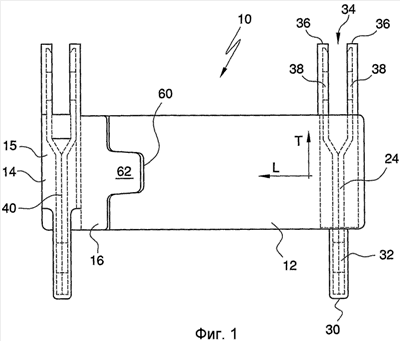 Как лучше показано на фиг.3 (и показано в полуразрезе на фиг.4), в основном, прямоугольная щель или канавка 60 со слегка наклонными стенками образована в конце боковой стенки 22. Канавка проходит от средней части боковой стенки канала 50 в направлении торцевой стенки 18. Стенки слегка наклонены одна к другой в направлении торцевой стенки 18.