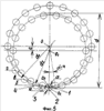 Сила F разложена на радиальную силу R и силу Р – перпендикулярную радиусу делительной окружности. Произведение силы Р на радиус есть крутящий момент редуктора (фиг 2). Сила R воспринимается радиальным подшипником редуктора. Для уменьшения силы R и увеличения силы Р необходимо сделать угол 1 как можно меньше. Для этого при проектировании зацепления по первому варианту делительные окружности роликов выполняют не касательными (фиг.5 и 6). Между роликами 1 и 2 и роликами 2 и 3 зазоров нет. Диаметр каждого ролика равен расстоянию между центрами касающихся друг друга роликов.