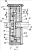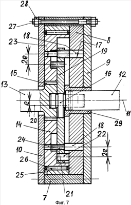 В корпусе, состоящем из кольца 7, стенки 8 и двух крышек 9 и 10, соосно оси 11 установлены быстроходный вал 12 и тихоходный вал 13. Последний связан (скреплен) с диском 14 шлицевым соединением 15. Эксцентрик 16 закреплен на быстроходном валу 12. Детали 8 и 9 могут быть выполнены из одного куска металла (как одно целое). Их можно назвать боковой крышкой (стенкой) корпуса. В боковой крышке (стенке) корпуса выполнены отверстия 17, в которых установлены ролики 18, равномерно расположенные по окружности с центром на оси 11. Диск 19 установлен на эксцентрике 16. Ось 20 совпадает с осью диска 19 и эксцентрика. Ролики 21 и 22 вставлены в отверстия, выполненные в диске 19, и равномерно расположены по двум концентрическим окружностям с центром на оси 20. В диске 14 выполнены отверстия 23, расположенные равномерно по окружности с центром на оси 11, в которые вставлены ролики 24, зацепленные с роликами 21. Ролики 22 зацеплены с роликами 18. Между кольцом 25 и диском 14 установлены игольчатые ролики 26. Редуктор стянут (скреплен) вдоль его оси 11 шпильками 27 и гайками 28. Вал 12 установлен в подшипнике 29.