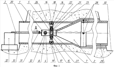 Располагая в стартовом приямке 30, устройство монтируют и заводят в старый трубопровод 20, предварительно соединив его винтами 28 с новым пластмассовым трубопроводом 29 и пропущенной через старый трубопровод 20 составной штангой 3 с гидродомкратом 32 (фиг.1). После включения гидродомкрата 32 он с помощью составной штанги 3 начинает статически (безударно) затягивать труборазрушающий рабочий орган 1 с расширителем 2 и новым пластмассовым трубопроводом 29 в старый трубопровод 20. Двигаясь в сторону приемного приямка 33, труборазрушающий рабочий орган 1 опирается на внутреннюю поверхность старого трубопровода 20 опорными катками 12, 13, разрезает его дисковыми ножами 18, 19, разделяя на две части, а также деформирует и вдавливает расширителем старый трубопровод 20 в грунт, одновременно затягивая новый пластмассовый трубопровод 29 по формируемой скважине. Опорные катки 12, 13 и дисковые ножи 18, 19 свободно вращаются, обеспечивая качение (а не скольжение) труборазрушающего рабочего органа 1, что облегчает его движение. Разрушение старых трубопроводов 20 разных диаметров осуществляется за счет изменения величины вылета вилок 8, 9, 14, 15 с опорными катками 12, 13 и дисковыми ножами 18, 19 из труборазрушающего рабочего органа 1. Закрепление вилок 8, 9, 14, 15 выполняется оперативно с помощью фиксаторов 24-27, устанавливаемых в их соответствующие пазы 22, 23. Уменьшение возможности перекоса устройства в старом трубопроводе осуществляется за счет опорных катков 12, 13, установленных перед дисковыми ножами 18, 19.