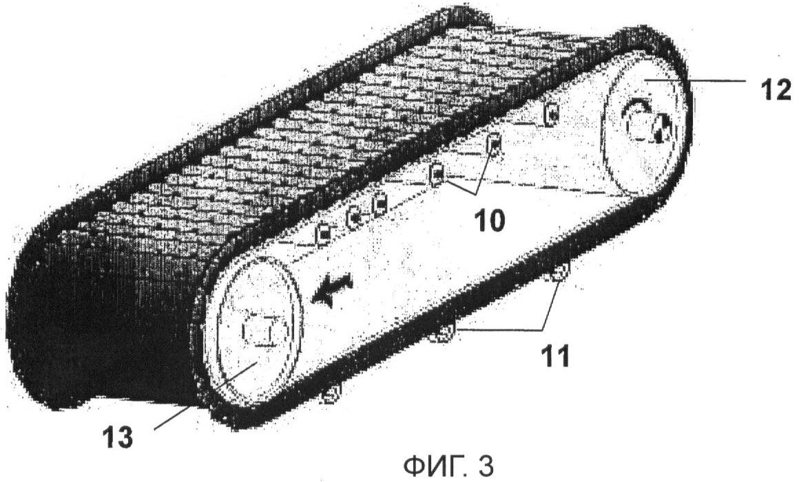 Фиг.3 – схематический вид металлической конвейерной ленты, иллюстрирующий тяговый 12 и возвратный 13 барабаны и верхние 10 и нижние 11 опорные поддерживающие ролики;