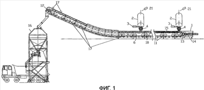 Фиг.1 – схематический вид сбоку конвейерной установки, в которой транспортировка к оконечному выпускному бункеру является исключительно механической;