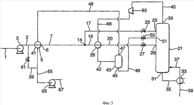 В качестве альтернативы, в трубопроводе 57 может быть предусмотрено расширительное устройство, такое как клапан Джоуля-Томпсона (Joule-Thompson) (не показан), которое призвано снижать давление в трубопроводе 57 до значения давления в трубопроводе 48. Теперь после объяснения схем процессов с фиг.1 и 2 перейдем к фиг.3, на которой показан вариант осуществления настоящего изобретения, основанный на варианте осуществления, показанном и объясненном со ссылкой на фиг.1, где система внутреннего орошения размещена в трубопроводе 48 между выпускным отверстием 39 парообразного дистиллята дистилляционной установки и первым теплообменным устройством 5. Система орошения, показанная здесь, содержит сепаратор газ/жидкость (в формуле изобретения называемый «первый сепаратор газ/жидкость»), который здесь имеет форму сосуда 43 разделения орошающего потока. Сосуд 43 разделения орошающего потока расположен ниже по потоку относительно второго теплообменного устройства 26 в трубопроводе 48 и соединен со вторым теплообменным устройством 26 с помощью трубопровода 42. Сепаратор 43 содержит нижнее выпускное отверстие 45 и выпускное отверстие 47 дистиллята. Нижнее выпускное отверстие 45 соединено с дистилляционной установкой 21 с помощью трубопровода 49 и третьей точки 51 подачи, что нужно для обеспечения орошающего потока. В трубопроводе 49 может быть расположен необязательно присутствующий регулирующий клапан 53. Целесообразно, чтобы третья точка 51 подачи была расположена выше, чем вторая точка 29 подачи, так как температура орошающего потока 49 обычно ниже температуры дополнительно нагретого сырьевого потока 20, и целесообразно, чтобы третья точка 51 подачи была расположена ниже первой точки 25 подачи.