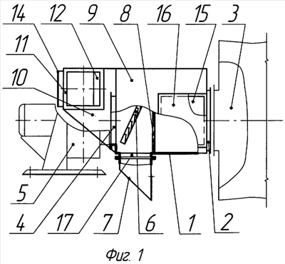 В первом режиме (фиг.3) двухпозиционный клапан 8 установлен в первое положение, в котором он полностью отделяет полость дополнительной секции 10 камеры 1 от первого окна 2, сообщая его с полостью основной секции 9. Проход 15 закрыт затвором 16, а четвертое окно 12 открыто клапаном 14. Пятое окно 17 в устройстве по первому варианту сообщается с глухой полостью сборника уноса 7 (фиг.1, 2), а по второму – закрыто затвором или съемной крышкой (не показаны). Вентилятор 5 создает разряжение в основной секции 9 камеры 1 и в коллекторе 3 камеры зерносушилки.