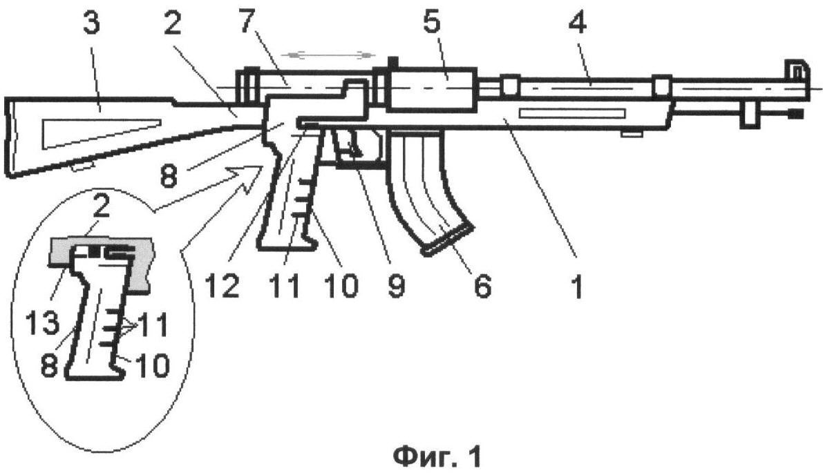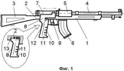 Возможно (вариант) выполнение фиксатора 12 неавтоматизированным (неавтоматическим), а включаемым и/или выключаемым вручную, принудительно, за счет, например, рычажка или кнопки (не показаны) в зоне расположения кисти руки стрелка, лежащей на рукоятке 8, аналогичных известному флажковому предохранителю или фиксатору пистолетной обоймы.