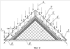 Примером конкретного исполнения может служить устройство (фиг.2.), где фрагменты-поглотители выполнены в виде пирамид, состоящие из металлического каркаса стали 3 (3) с установленными на его внешней поверхности по направлению газового потока (4) пластинами из стали 3 (5). Пластины установлены с целью предотвращения образования пограничного слоя и свободного обтекания фрагментов-поглотителей газовыми потоками без их фильтрации в слоях фрагментов-поглотителей. Внутри каркаса установлен поглощающий элемент, состоящий из пенопласта плотностью 0,1 г/см3 (6), а поверх него установлен многослойный пакет из стальных проволочных сеток с размерами ячеек в свету 40, 50, 100, 200, 500 мкм и 1, 2 мм (7). При установке пластин предусмотрен зазор (s) между ними и многослойным пакетом, а в основании из стали 3 (8) фрагментов-поглотителей – отверстия (9), сообщаемые с воздушным зазором для выхода газовых потоков. При этом высота пластин, расстояние между ними и величина воздушного зазора выбраны следующие: h=11,5 мм; l=10 мм; s=9 мм.