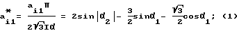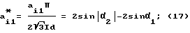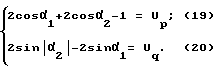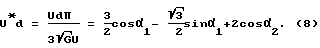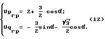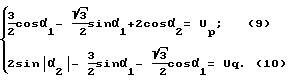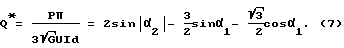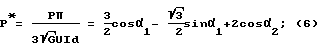 Осуществляя разложение кривой тока ia(v) в ряд Фурье, запишем выражение для косинусного и синусного коэффициента при первом слагаемом тригонометрического ряда в относительной системе координат![]() ![]() что дает возможность рассчитать действующее значение основной гармоники сетевого тока ![]() фазовый сдвиг этой гармоники относительно сетевого напряжения ![]() а также активную и реактивную мощности на сетевом входе P = 3UI1cos 1, Q = 3UI1sin 1. (5)После подстановки (1), (2) в (3), (4), (5) относительные значения активной и реактивной мощностей выразятся ![]() ![]() Замечаем, что относительное значение средневыпрямленного напряжения совпадает с относительным значением активной мощности при условии сглаженного тока Id = const ![]() Вводя понятия управляющих сигналов для осуществления пропорционального регулирования активной и реактивной мощностей Up = P* = Ud*, Uq = Q*, запишем закон управления указанными составляющими полной мощности на сетевом входе трехфазного мостового преобразователя ![]() Данная система уравнений совместна и ее решение относительно углов управления 1, 2 позволит осуществить независимое пропорциональное регулирование активной и реактивной мощностей в пределахUp Upгр; Uq = Uqгр.