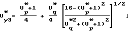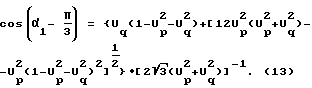 Граничные значения управляющих сигналов Upгр, Uqгр можно получить, подставляя в (9) и (10) граничное значение одного из углов управления. Так, например, задаваясь граничным значением первого угла управления 1= 0, запишем![]() Аналогичным образом, задаваясь граничным значением второго угла 2= 0, запишем![]() Придавая углу управления всевозможные значения, с помощью (11), (12) на фиг. 3 построены фазовые траектории, связывающие граничные значения управляющих сигналов между собой. Заштрихованная область на этом графике удовлетворяет граничным условиям обоих уравнений. Спроецировав граничное значение одной управляющей координаты на границу указанной области, можно получить граничное значение другой, как это показано на чертеже. Решая систему уравнений (9) и (10) относительно одной из тригонометрических функций, получаем![]() Данное уравнение можно рассматривать как уравнение точки встречи представленного справа управляющего сигнала, являющегося функционалом координат Uy1 = f(Up, Uq) следующего вида: ![]() и представленного слева опорного сигнала косинусоидальной формы сетевой частоты, смещенного по фазе относительно точки естественной коммутации вентиля | 1= 0| в сторону опережения на угол /3. Решение уравнения точки встречи дает искомый угол управления при первом включении вентиля на периоде сети 1= arccosUy1+ /3.Аналогичным образом отыскивается уравнение точки встречи управляющего и опорного сигналов при втором включении вентиля ![]() Принимая правую часть (15) за управляющий сигнал вида Uy2 = {Up(1+Up2+Uq2)-[16Uq2(Up2+Uq2)-Uq2(1+Up2+Uq2)2] 1/2}[4(Up2+Uq2)]-1, (16) а левую часть – за выражение опорного сигнала косинусоидальной формы с вершиной, совпадающей с точкой естественной коммутации | 2= 0|, отыскиваем угол управления, а вернее его модульное значение при втором включении| 2| = arccosUy2.Геометрическая трактовка решения системы уравнений (9), (10) дана на графике фиг. 3 в виде временных диаграмм управляющих Uy1, Uy2 и опорных Uоп напряжений СИФУ, работающей по вертикальному принципу. Согласно данному принципу изменение управляющих напряжений (14), (16) по величине /вертикали/ приводит к необходимому изменению углов включения вентилями. Видно, что в качестве опорных напряжений может быть использована система фазных напряжений сети Ua, Ub, Uc, каждое из которых на определенных участках периода длительностью может служить для отыскания момента включения того или иного вентиля. Вершины полуволн этих напряжений опережают на /3 точки естественной коммутации одних и совпадают с точками естественной коммутации других вентилей моста. Поэтому монотонные участки этих напряжений правее указанных точек можно использовать для отыскания каждого первого включения вентиля с отстающим углом управления 1 0, а участки, располагающиеся левее указанных точек – для отыскания каждого второго включения с опережающим углом управления 2 0. Так, например, первое включение вентиля 1 отыскиваем в точке /v1/ пересечения опорного напряжения /фаза C/ с управляющим сигналом Uy1. Это включение будет происходить с отстающим относительно начала положительной полуволны линейного напряжения сети углом 1. Согласно правилу попарной работы вентилей моста полученный в указанной точке импульс должен быть также направлен на вентиль с номером 6 в анодной группе моста. Второе включение пары вентилей с номерами 1,6 должно произойти в момент v2 с о