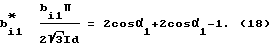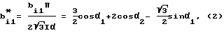 Данный способ обеспечивает возможность изменения обоих углов управления по модулю в пределах от 0 до , что необходимо для регулирования преобразователя как с отстающим, так и опережающим коэффициентом сдвига. В частном случае возможно регулирование выпрямленного напряжения и, соответственно, активной мощности при коэффициенте сдвига, равном единице. Для этого достаточно установить нулевое значение управляющего воздействия Uq=0 на входе функционального построителя. Однако расчеты показывают, что данный режим имеет место при неравенстве углов управления 1 | 2|. Так, например, при установке управляющих воздействий Uq = 0, Up = 0,5 работа компенсированного преобразователя будет происходить с углами управления 1= 1,495 рад, | 2| = 0,896 рад. В конечном итоге данный недостаток ведет к недоиспользованию преобразователя по мощности. Причина усматривается в несимметрии кривой фазного тока относительно напряжения. Для устранения данного недостатка в режиме компенсированного преобразователя предлагается управлять вентилями с трехкратным включением на периоде сети. Как следует из временных диаграмм на фиг. 2, отличие состоит лишь в дополнительном включении каждой пары вентилей моста в момент времени, отстоящий от точки естественной коммутации одного из них /начала положительной полуволны соответствующего линейного напряжения сети/ на 180o вправо. Этим достигается необходимая симметрия кривой тока в режиме 1= | 2| и, соответственно, изменятся аналитические выражения, описывающие данный закон управления. Теперь выражения для косинусного и синусного коэффициентов Фурье при первом слагаемом ряда при описании фазного тока сети примут вид![]() ![]() Основываясь на вышеизложенном, запишем закон управления средневыпрямленным напряжением и составляющими полной мощности на сетевом входе преобразователя при управлении с трехкратным включением вентилей на периоде сети ![]() Решение данной системы уравнений относительно модульных значений углов управления 1,2 даст выражение![]() Рассматривая это выражение как уравнения точек встречи управляющих и опорных сигналов, получим угол управления при первом включении 1= arccosUy3, (22)где необходимое для этого управляющее напряжение на выходе функционального построителя выразится Uy3 = 0,25{Up + 1 + Uq[(16 – (Up + 1)2)(Uq2 + (Up + 1)2)-1]1/2}. (23) Второе включение вентилей на каждом периоде сети должно происходить, как отмечалось, с постоянным углом управления, равным . Из уравнения (21) получаем модуль угла управления при третьем включении| 2| = arccosUy4, (24)где необходимое выражение управляющего напряжения на выходе функционального построителя запишется Uy4 = 0,25{Up + 1 – Uq[(16 – (Up + 1)2)(Uq2 + (Up + 1)2)-1]1/2}. (25) Пример возможной реализации предложенного способа управления на аналоговых элементах приведен на схеме фиг. 5. Силовая часть преобразователя выполнена по трехфазной мостовой схеме выпрямления на вентилях 1-6. Система импульсно-фазового управления содержит задатчики активной /7/ и реактивной /8/ составляющих полной мощности на сетевом входе. Выходы задатчиков подключены ко входам функционального построителя 9, реализующего зависимость между входными и выходными сигналами, согласно выражениям (14), (16) или (23), (25). Выходы функционального построителя подключены ко входам блока компараторов 10, вторые входы которого связаны с вторичными обмотками сетевого согл