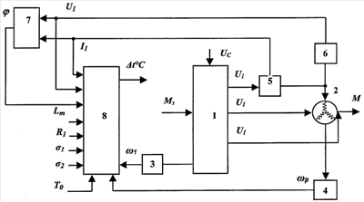 Задание на требуемый вращающий момент Мз подают в инвертор 1, который подключен к сети с напряжением Uc и питает электроэнергией обмотки статора 2. Штатные датчики: 3 – частоты тока статора 1; 4 – частоты вращения ротора р; 5 – силы тока фазы статора; 6 – напряжения обмотки статора U1; 7 – величины угла фазового сдвига между напряжением и током фазы статора , подают информацию в вычислительное устройство температуры обмотки ротора 8, в которое также подают сигналы о величине сопротивления фазной обмотки R1, величине индуктивности цепи намагничивания статора 1 и поля ротора 2 и величине эталонной электромагнитной постоянной времени обмотки ротора Т0.