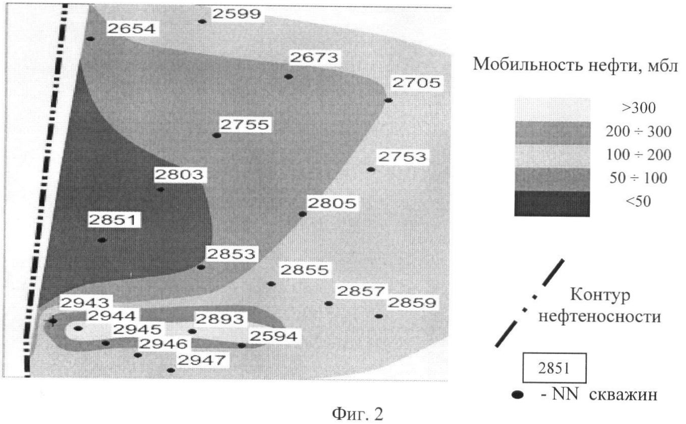 На основе использования настоящего изобретения в режиме профильного и площадного мониторинга проведены систематические ЯМР исследования нефтей из залежей Западно-Сибирской, Тимано-Печорской и Волго-Уральской НГП. На фиг.2 представлена реокарта распределения мобильности нефти из скважин на опытном участке Х-й залежи (Зап. Сибирь), где скважины, добывающие нефть повышенного качества, находятся в основном в южном и восточном его секторах, а скважины, извлекающие нефти низкой подвижности, приурочены к западному сектору этого участка, где разработка перспективна лишь с применением теплового воздействия.