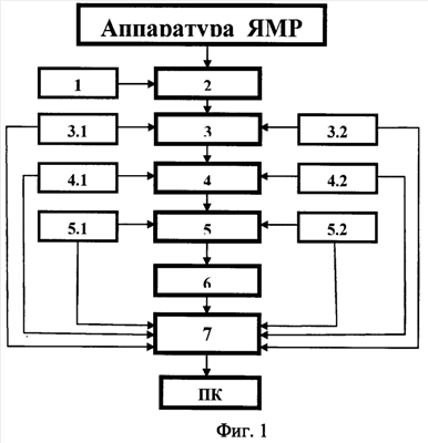 18. На этой основе устройство действует следующим образом: пробы отобранной нефти помещаются в датчик магнитной системы измерительного модуля 2, блоком настройки 1 проводится оптимизация условий и параметров последующего измерения ЯМР характеристик, которые затем обрабатываются блоком 3, после чего обработанные данные с его выхода последовательно поступают на входы блока 4, где определяются показатели текучести (мобильности) нефти, и блока 5 для построения и анализа ее спектров, а затем в блок 6 для термотестирования свойств этой нефти; в заключение блоком 7 на базе ПК строятся реопрофили, реокарты и нефтединамическая модель разрабатываемой залежи в целом.