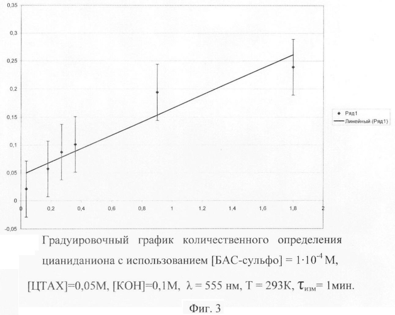 Результаты, полученные при анализе стандартных растворов цианиданиона, представлены на Фиг.2. На основе этих результатов строится градуировочный график количественного определения цианиданиона (Фиг.3) в воде.
