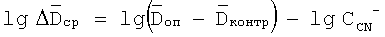 Готовятся рабочие растворы цианистого калия в диапазоне концентраций (1,0·10-5-2,0·10-8) мг/мл. К 1,0 мл исследуемой концентрации цианистого калия в этиловом спирте прибавляется 1,0 мл 0,35 М паранитробензальдегида в метилцеллозольве, 1,0 мл 0,084 М раствора бензофуроксана в метилцеллозольве и 1,0 мл 0,2 М раствора гидроокиси калия в этиловом спирте. Смесь перемешивается, переливается в кювету с длиной оптического пути 1 см и устанавливается в рабочую камеру спектрофотометра. Одновременно готовится контрольный опыт, в котором вместо раствора цианистого калия используется только его растворитель – этиловый спирт. Замер оптической плотности как в опыте, так и в контроле проводится при длине волны 435 нм на 30 минуте опыта. Проводится анализ четырех-пяти концентраций цианистого калия в диапазоне концентраций от 2,0·10-8 до 1,0·10-5 мг/мл. Градуировочный график строится в координатах , который представлен на чертеже. Экспериментальные данные для его построения представлены в таблице.