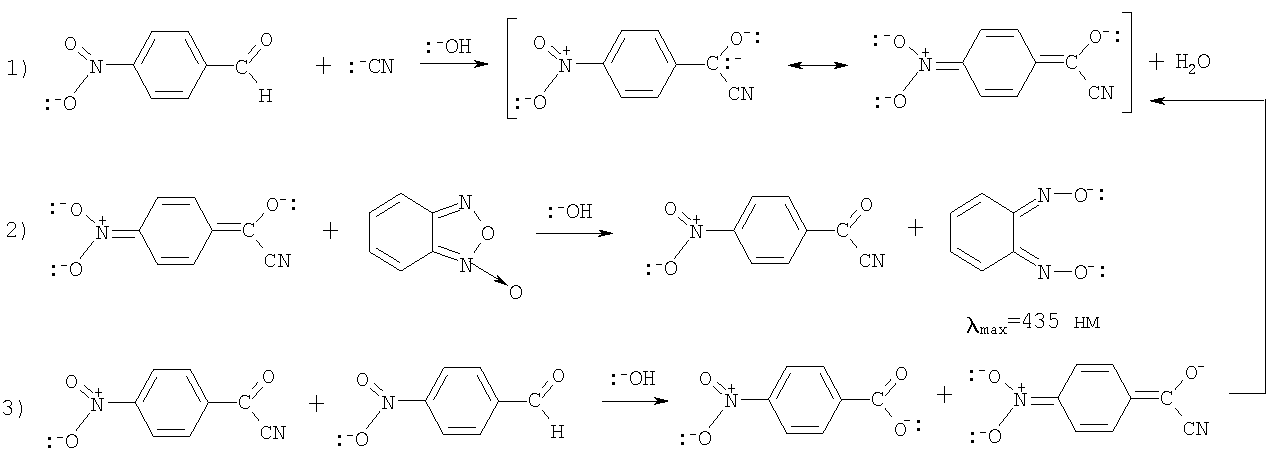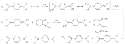 Основу каталитического определения цианид-аниона составляет обратимость электронных переносов паранитробензциангидрина между хромогенными окислителями группы бензофуроксанов и паранитробензальдегидом в щелочной среде метилцеллозольв – этиловый спирт.